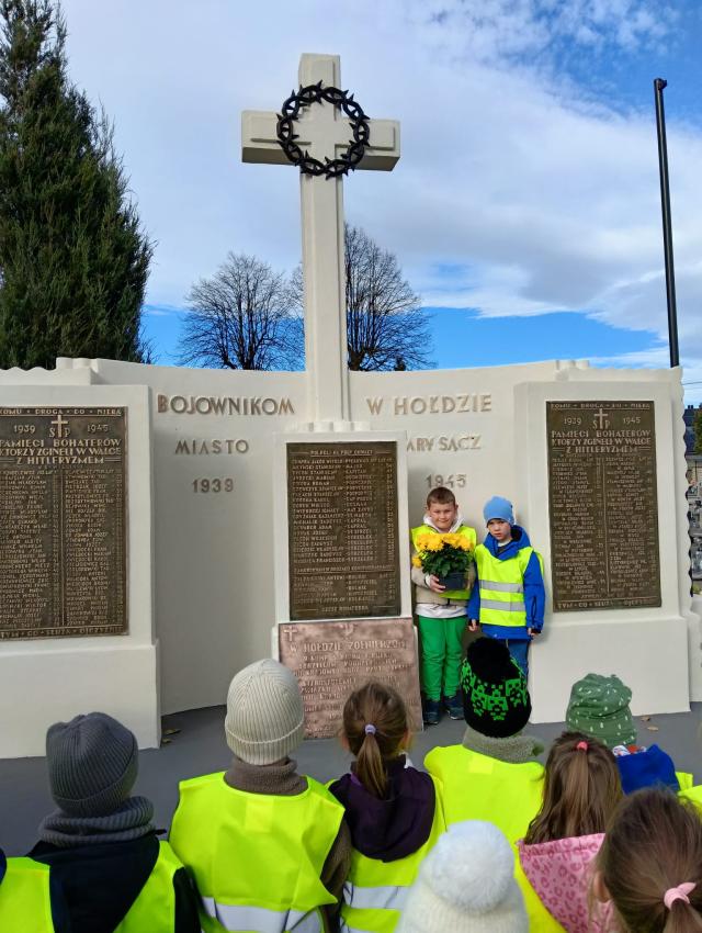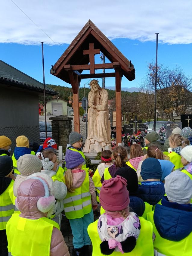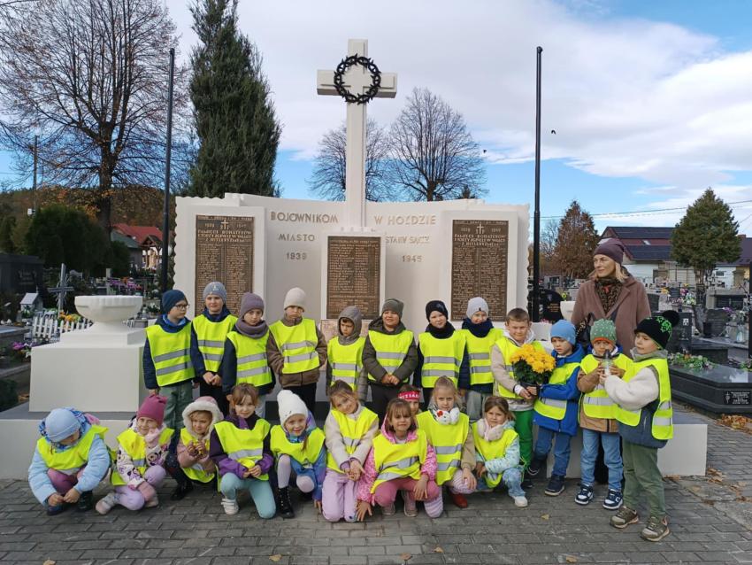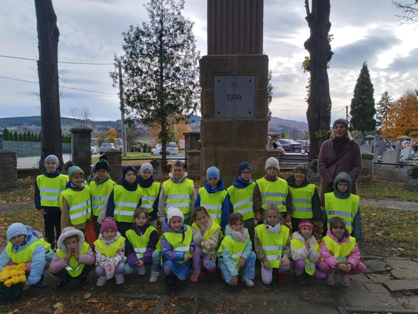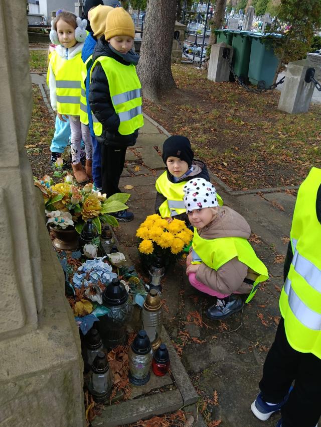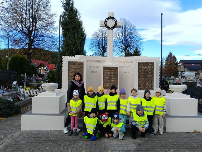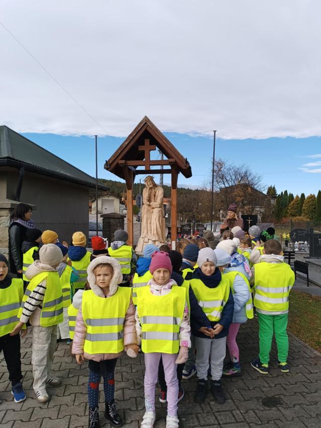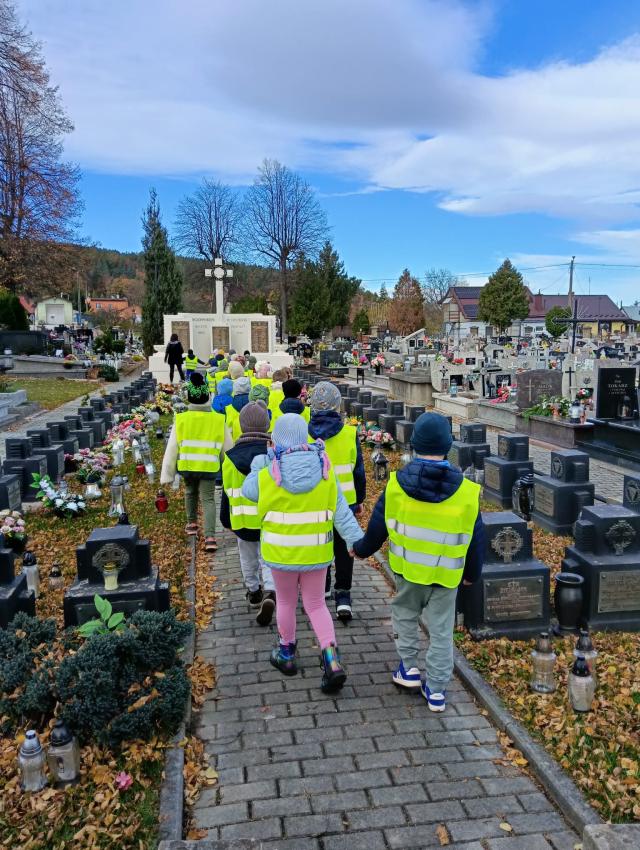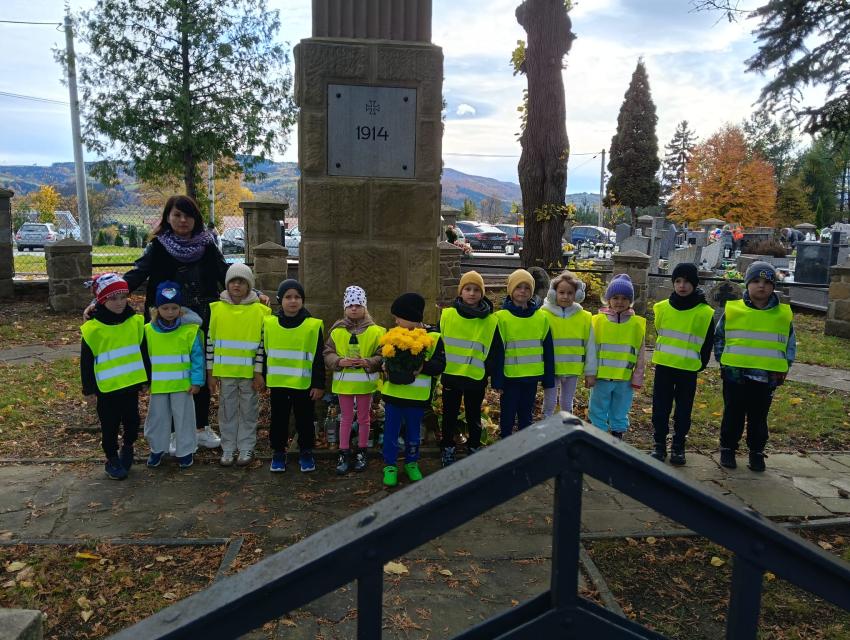 Kilka dni przed uroczystością Wszystkich Świętych, dzieci z obu grup zerowych udały się na miejscowy cmentarz. Podczas spaceru odwiedziły pomnik żołnierzy poległych w czasie I i II wojny światowej oraz pomnik Ofiar Zbrodni Katyńskiej. Przedszkolaki złożyły znicze i z szacunkiem uczciły pamięć bohaterów, którzy oddali życie za Ojczyznę. Wyjście było okazją do rozmowy o znaczeniu pamięci o zmarłych oraz kształtowało postawy patriotyczne i empatię wobec innych.